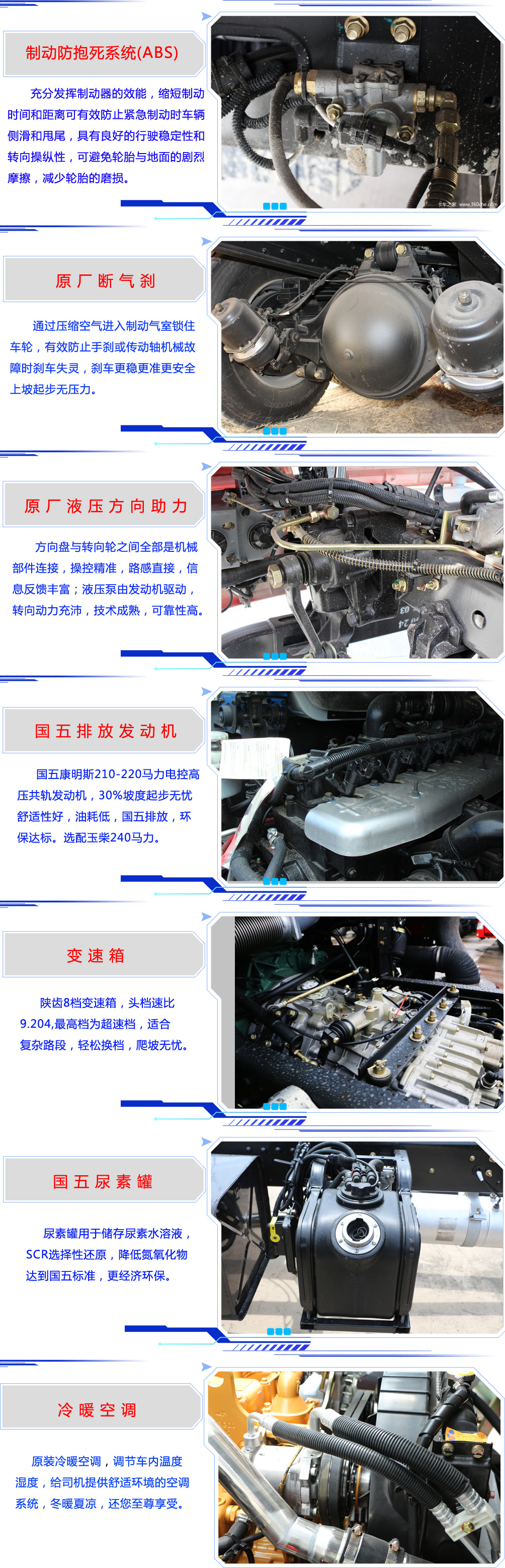 1,罐體有效容積18.82立方米,介質:丙酮水溶液,密度:800千克/立方米,罐體尺寸為(mm): 6900×2400×1500。2,防護材料:Q235A碳鋼,連接方式:左右側面及后下部防護均采用焊接連接,后部防護斷面尺寸(mm):150×50,后部防護離地高度(mm):550。3,ABS控制器型號為ABS-E 4S/4M,生產廠家為威伯科汽車控制系統(中國)有限公司 。4,文字噴涂位置、車輛顏色及局部細節可變化。 |