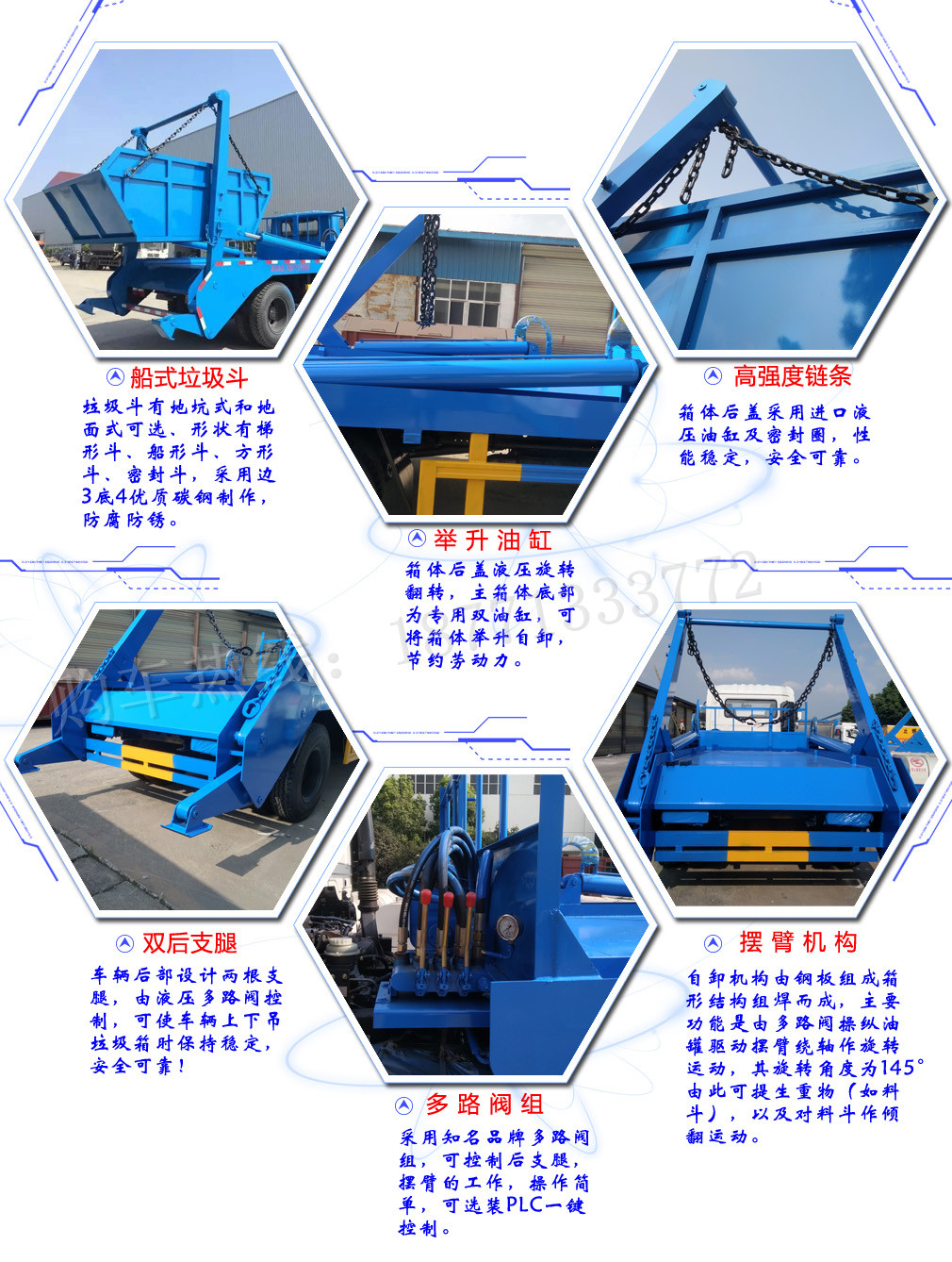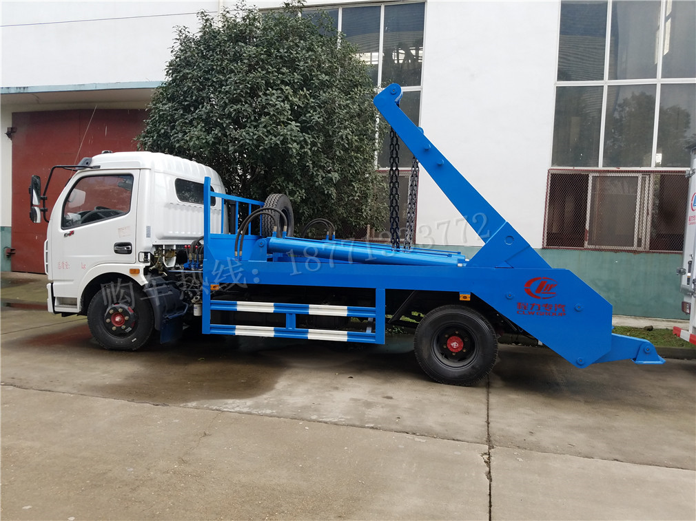 擺臂式垃圾車適用全國通用垃圾斗,帶自卸功能,液壓操作,垃圾斗可自吊上吊下,擺臂一次工作循環時間:60S。該車的特點是貨斗與車體分開,能實現一臺車與多個貨斗聯合作業,循環運輸,充分提高了車輛的運輸能力,特別適用于短途運輸,如環衛部門對城鎮垃圾的清理、運輸等。