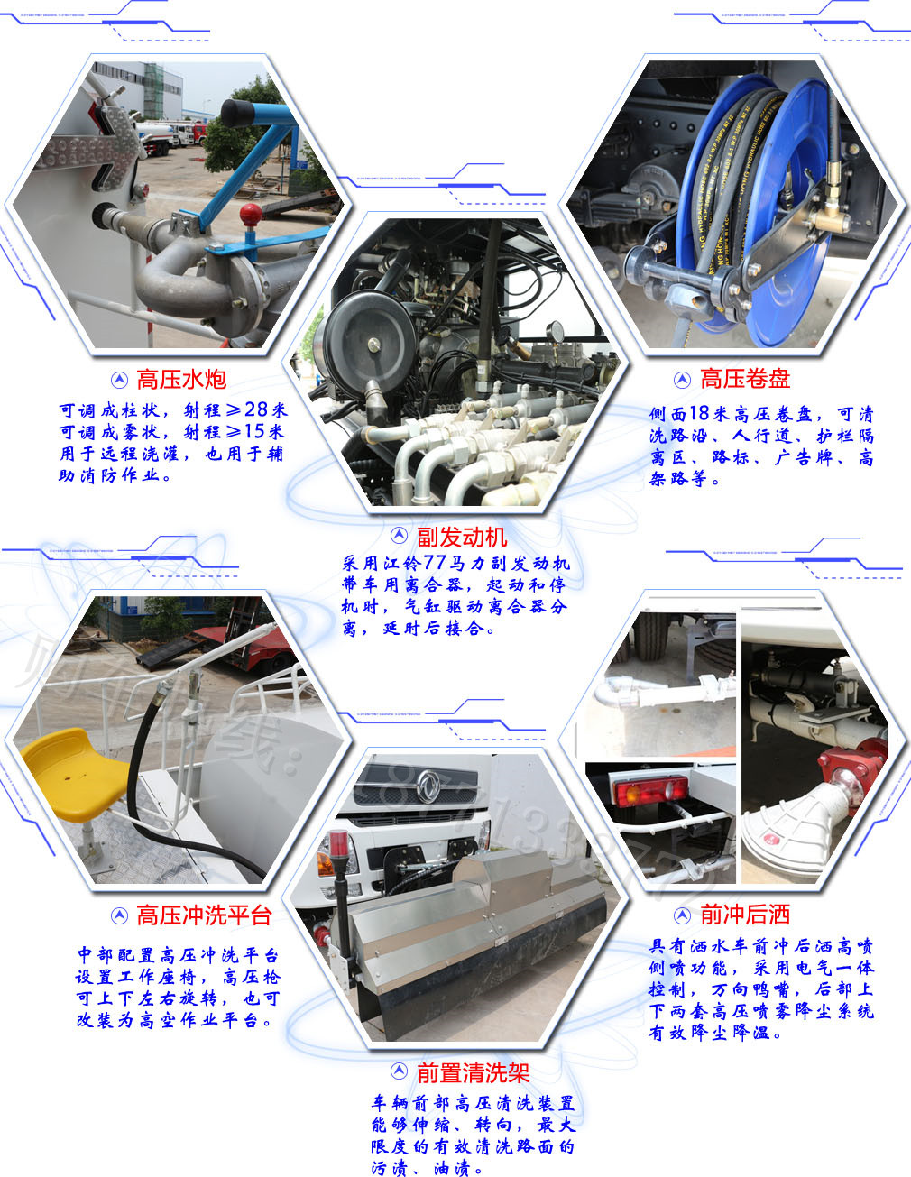 道路清洗車具有副發動機驅動的獨立的高壓水路系統和底盤驅動的低壓水路系統。高壓清洗高效節水,清洗距離長,適應公路加水距離遠的特點;低壓水路的綠化澆灌裝置,適用于公路綠化帶澆灌時需低速行駛的工況;噴霧系統,可以噴霧降塵、調節空氣濕度及噴灑空氣消毒劑。 該車電、液、氣集中控制,整車具有良好的人機操作界面,操作方便靈活,駕駛員可在配備冷暖空調的駕駛室內完成各種動作的操作,減輕了駕駛員的勞動強度,更加安全、舒適。