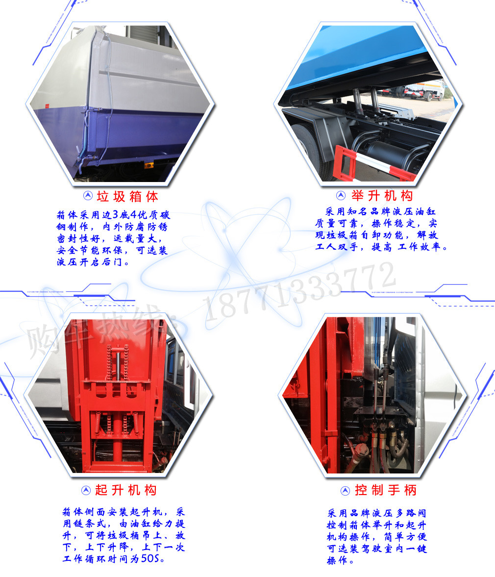 掛桶垃圾車的特點是一個車能配幾十個垃圾桶,能實現一臺車與多個垃圾桶聯合作業,循環運輸,充分提高了車輛的運輸能力,特別適用于短途運輸,如環衛部門對城鎮垃圾的清理、運輸等。同時,掛桶垃圾車還可以加裝其它功能,形成其它多功能掛桶垃圾車,如:掛桶壓縮式垃圾車、掛桶式泔水垃圾車、掛桶式對接垃圾車等。