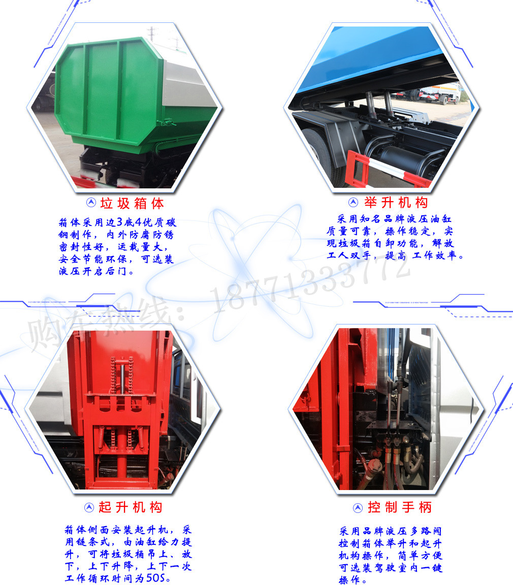 掛桶垃圾車的特點是一個車能配幾十個垃圾桶,能實現一臺車與多個垃圾桶聯合作業,循環運輸,充分提高了車輛的運輸能力,特別適用于短途運輸,如環衛部門對城鎮垃圾的清理、運輸等。同時,掛桶垃圾車還可以加裝其它功能,形成其它多功能掛桶垃圾車,如:掛桶壓縮式垃圾車、掛桶式泔水垃圾車、掛桶式對接垃圾車等。